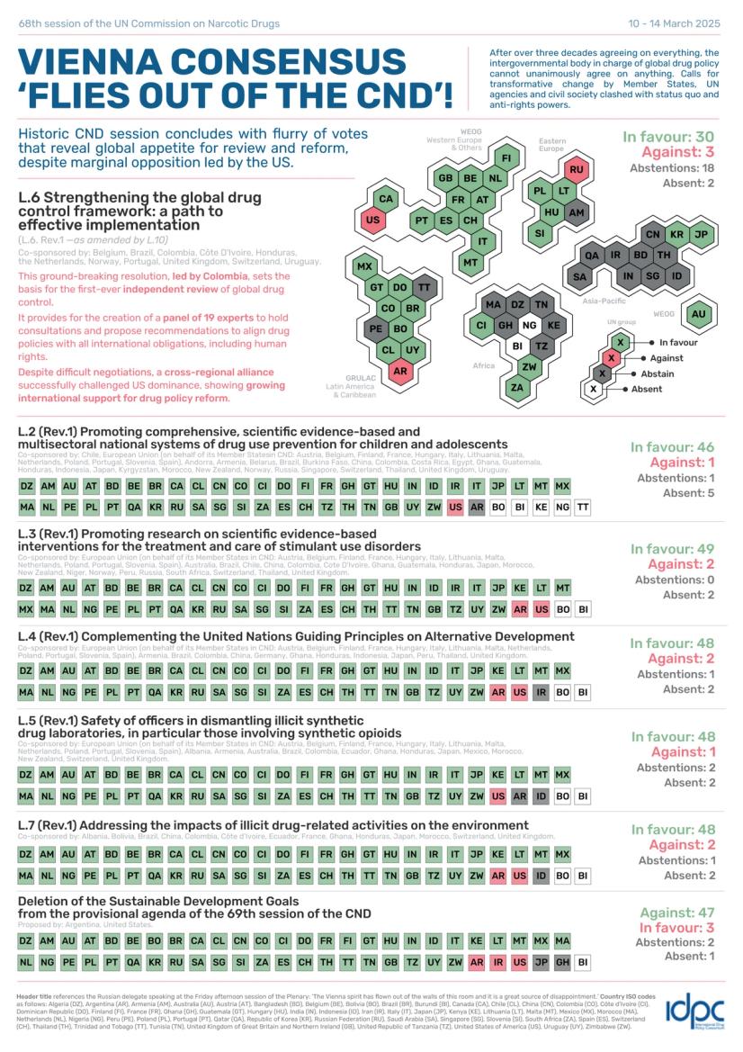 1. The United States is not all-powerful. At the start of the week, the US delegation shook the CND with a breathtakingly arrogant opening statement that broke the basic premise of the so-called Vienna spirit by disrespecting other Member States in directly naming and blaming Canada, China and Mexico for the US domestic toxic drug crisis that has caused hundreds of thousands of overdose deaths. This was followed with inflexible positions and a general unwillingness to negotiate throughout the week. By Friday arrogance had turned into isolation. At the closing of the session, the United States went on to lose all substantive policy votes, accompanied only by new bedfellows Argentina and Russia.