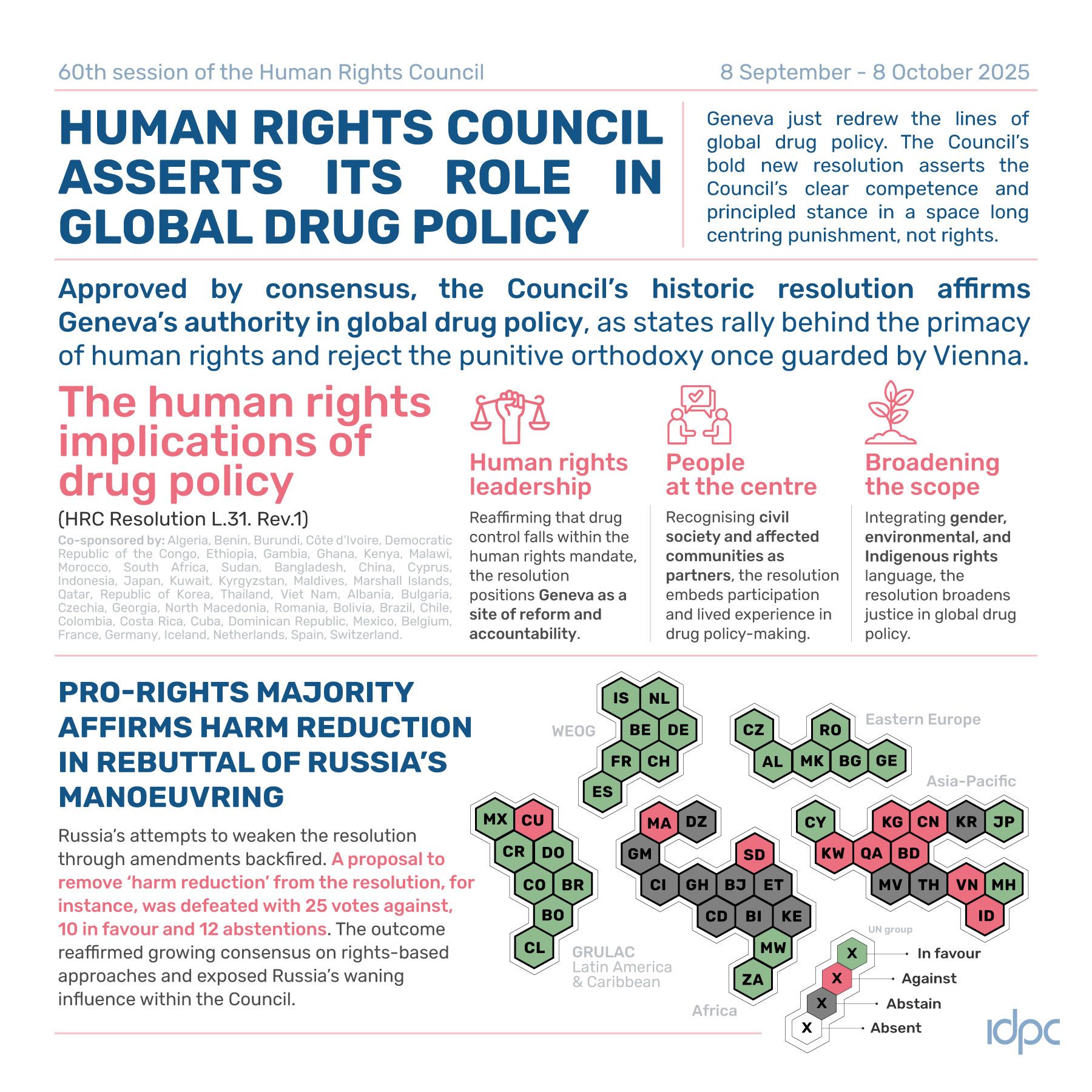 The resolution – introduced by Colombia on behalf of a cross-regional group – was adopted by consensus, and has so far been supported by 35 co-sponsors.¹ This reinforces the role of human rights in drug policy debates precisely as the international community embarks on an independent review of the global drug control regime. A shifting geopolitical landscape - with the USA now openly carrying out extrajudicial killings off the coast of Venezuela in the name of drug control - made the urgency of this initiative clearer than ever to many in Geneva.