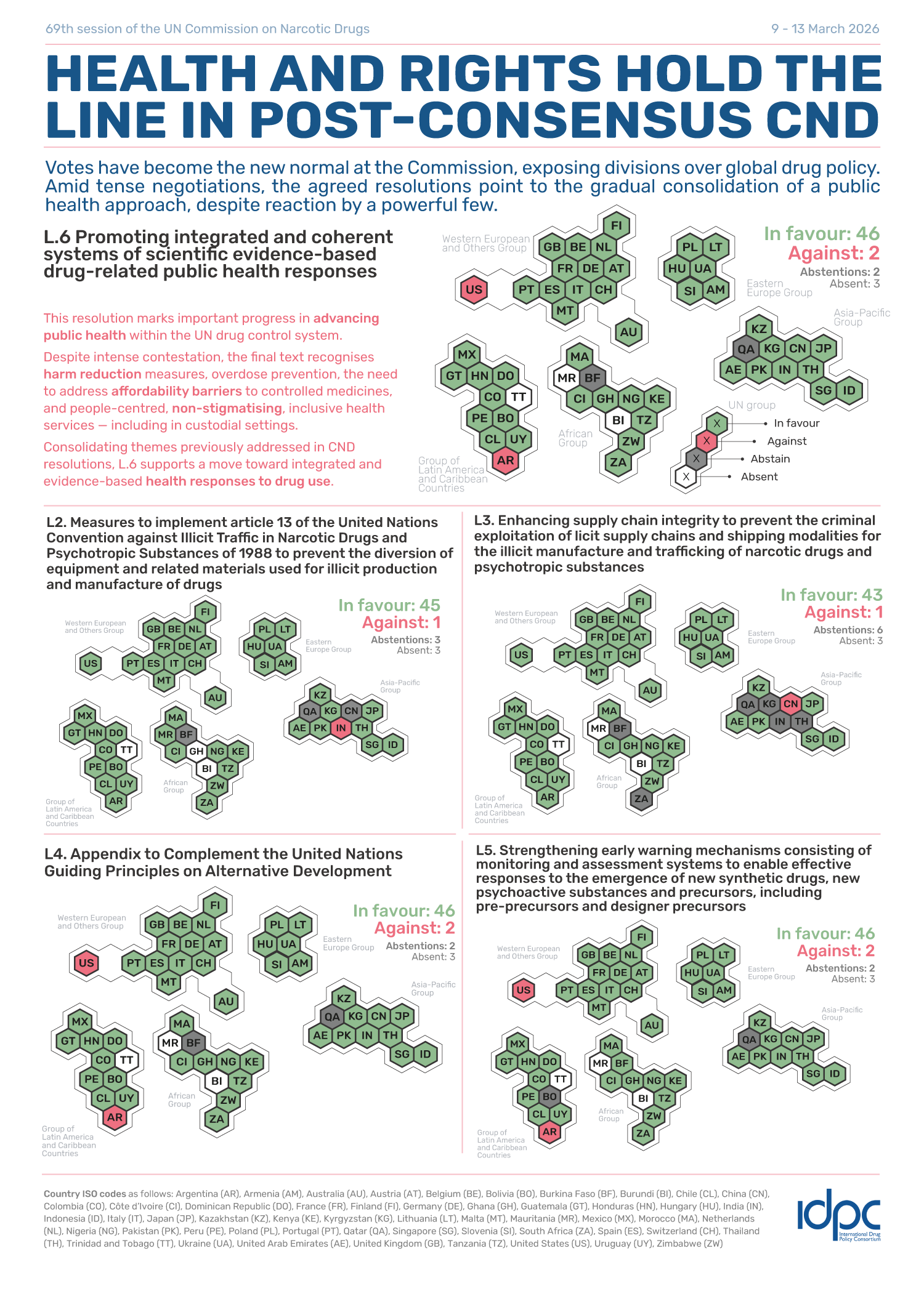 By 2026, the landscape had shifted again. The Norway/Finland resolution, which contains many positive commitments in addition to the specific reference to harm reduction, was adopted with 45 votes in favour—including China. Burkina Faso and Qatar abstained; only the United States and Argentina voted against. The United States, now under a very different administration, called for the vote and argued that harm reduction “contributes to the normalisation of drug use”— a 180-degree (but not unexpected) U-turn from their position of leadership and coalition building in 2024. Crucially, Russia – stripped of CND voting rights for the first time this year – had also agreed to the resolution text around the negotiating table. As one delegate remarked to me: “That is as close to consensus as you can get nowadays”. But diplomatic compromises were made to achieve this result and to ensure that as many States as possible voted in favour (or at least abstained). It is likely that the desire to isolate the United States – who objected during negotiations (and throughout the CND – more on this below) to references to the World Health Organisation (WHO), the Sustainable Development Goals (SDGs) and gender rather than explicitly to ‘harm reduction’. The compromises accepted include a footnote declaring that “Harm reduction is not a universally agreed concept among Member States”, and UNODC’s contested language that all responses are “part of a recovery-oriented continuum of care”.