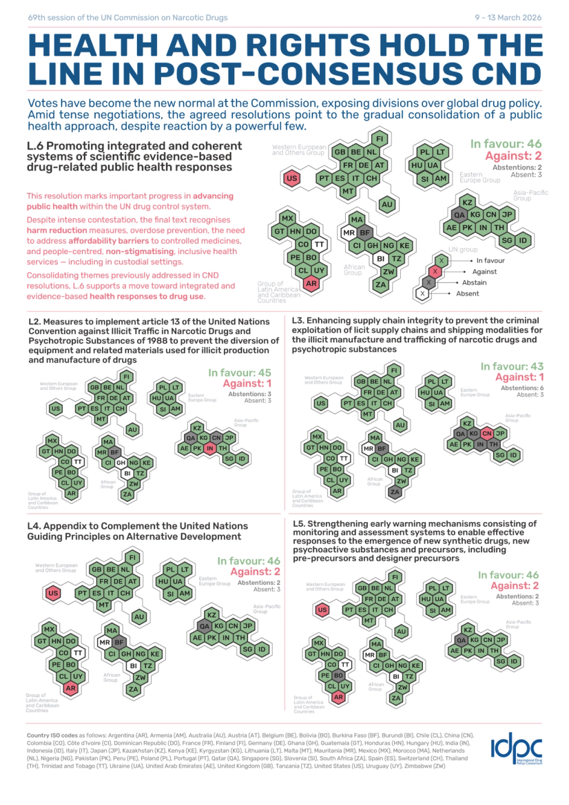 This shift began to crystallise in 2024, when harm reduction was explicitly included in a CND resolution for the first time—ironically led by the United States under the Biden administration. Russia called for a historic vote, breaking with decades of consensus practice. The 2024 resolution was backed by 38 of the 53 countries with a vote (with 6 abstaining, 7 absent and only China and Russia voting against).