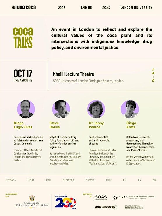 Organised by Futuro Coca in association with the Colombian Embassy, SOAS, and the International Coalition for Drug Policy Reform & Environmental Justice, this event will explore the coca plant’s critical intersections: with Indigenous knowledge systems, drug policy frameworks, and environmental justice.